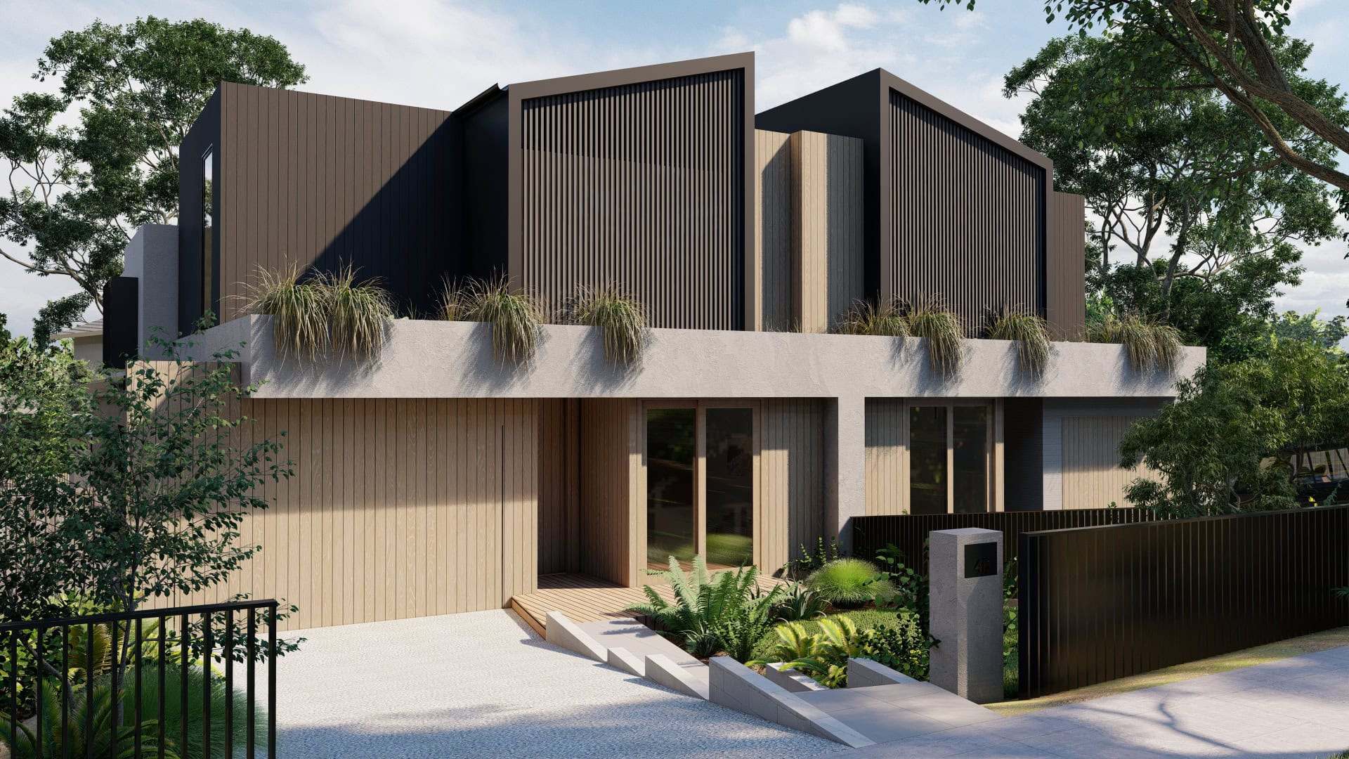 This is a proposed development of two townhouses. The site is on a corner of a major road and adjacent to a secluded park. From the site there are potential views to the south-west of Port Phillip Bay. We are anticipating a permit in May 2018.